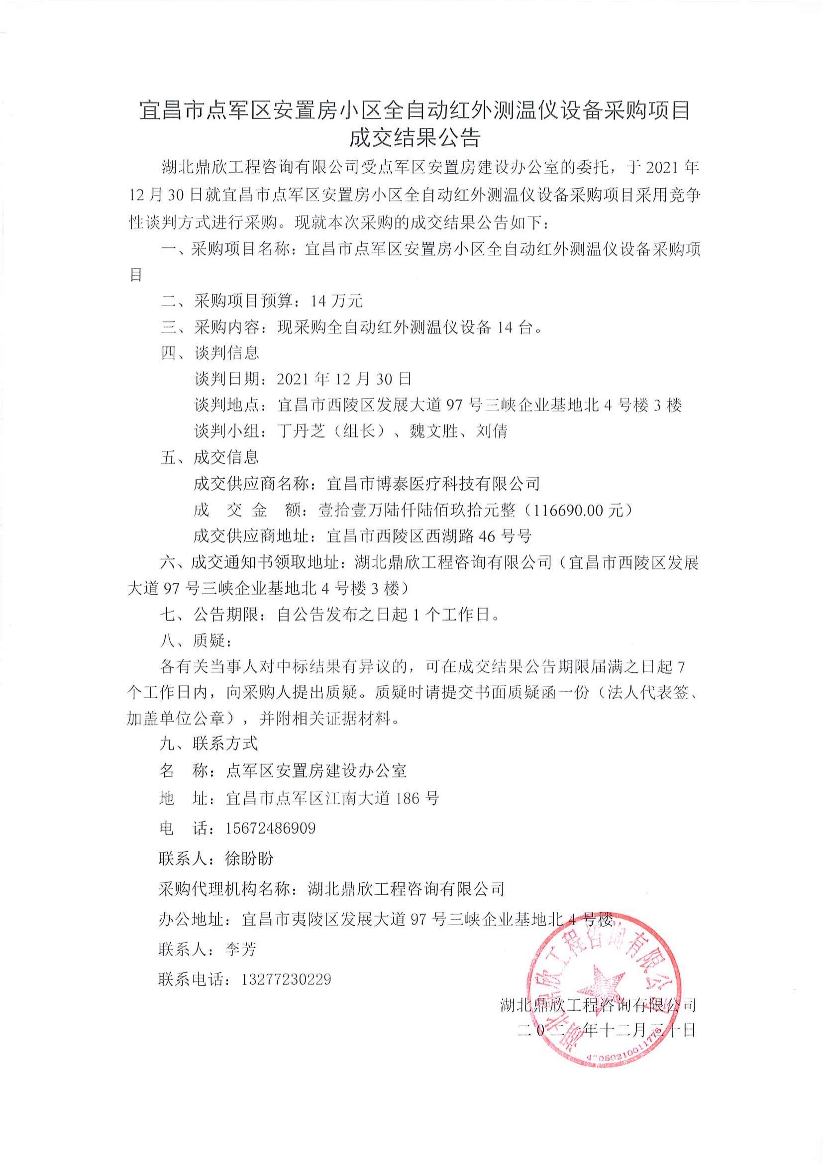宜昌市點軍區(qū)安置房小區(qū)全自動紅外測溫儀設備采購項目成交公告
