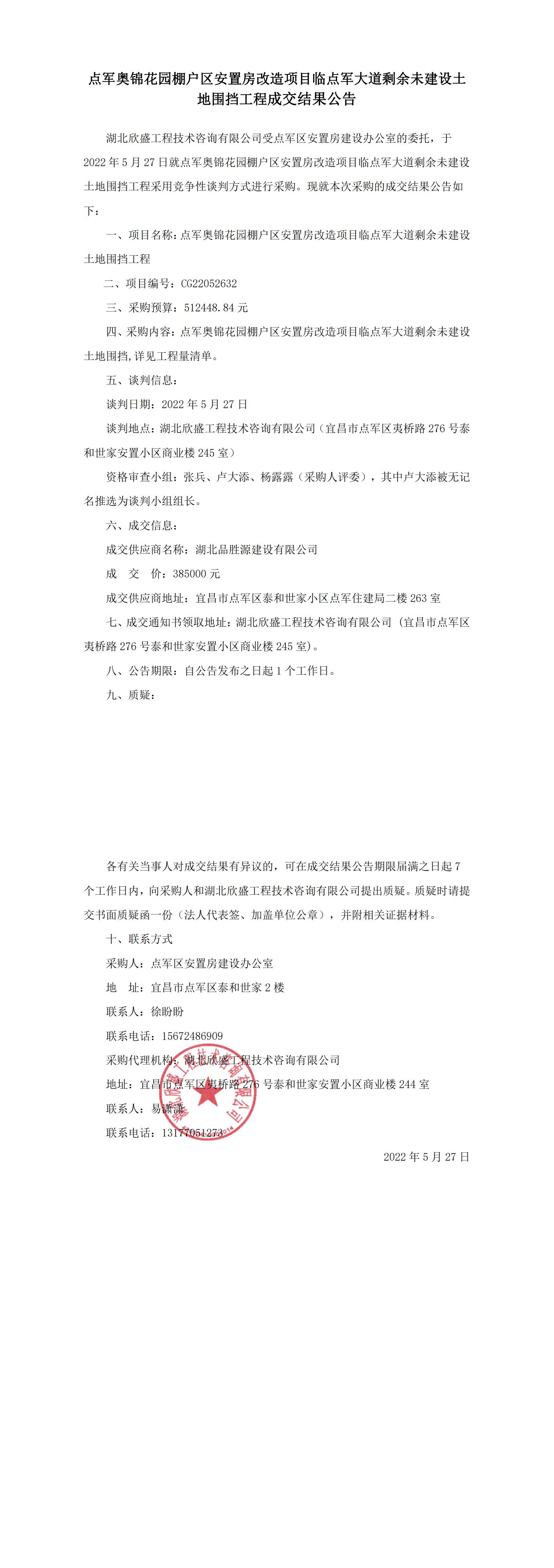點(diǎn)軍奧錦花園棚戶(hù)區(qū)安置房改造項(xiàng)目臨點(diǎn)軍大道剩余未建設(shè)土地圍擋工程成交結(jié)果公告