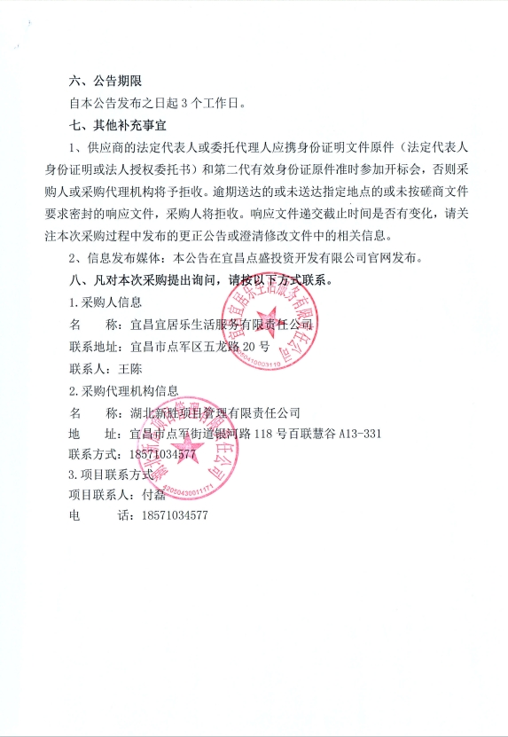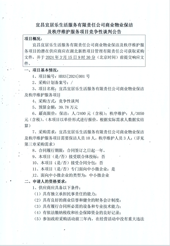 宜昌宜居樂生活服務(wù)有限責(zé)任公司商業(yè)物業(yè)保潔及秩序維護(hù)服務(wù)項目競爭性談判公告