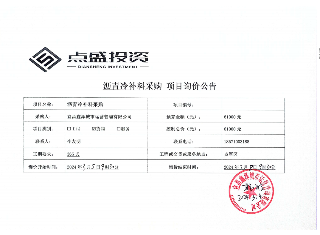 宜昌鑫澤城市運(yùn)營(yíng)管理有限公司瀝青冷補(bǔ)料采購(gòu)項(xiàng)目詢價(jià)公告