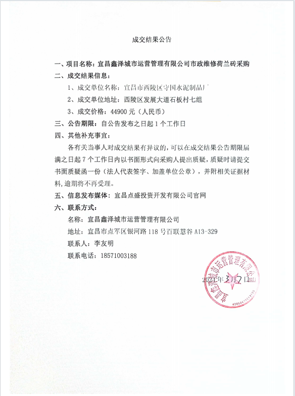 宜昌鑫澤城市運營管理有限公司市政維修荷蘭磚采購項目成交公告