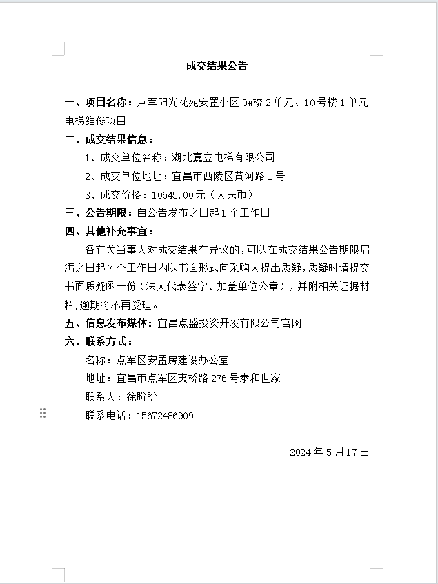 點(diǎn)軍陽光花苑安置小區(qū)9#樓2單元、10號樓1單元電梯維修項(xiàng)目成交公告