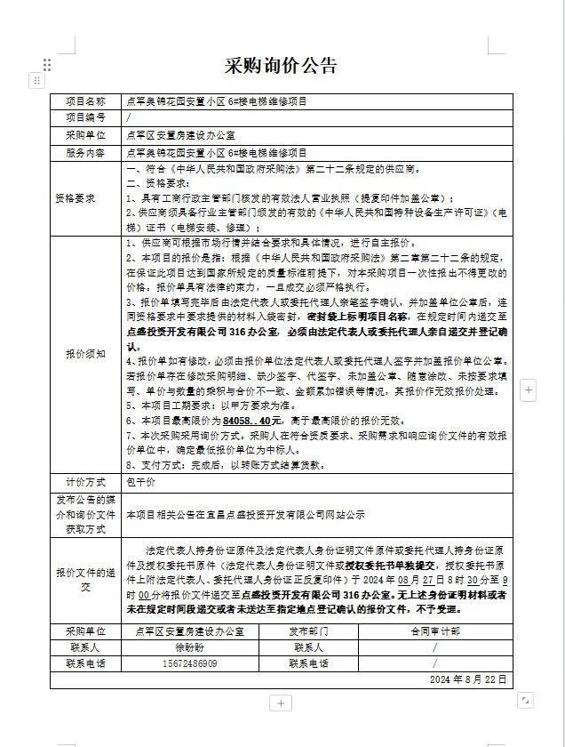 點軍奧錦花園安置小區(qū)6#樓電梯維修項目詢價公告