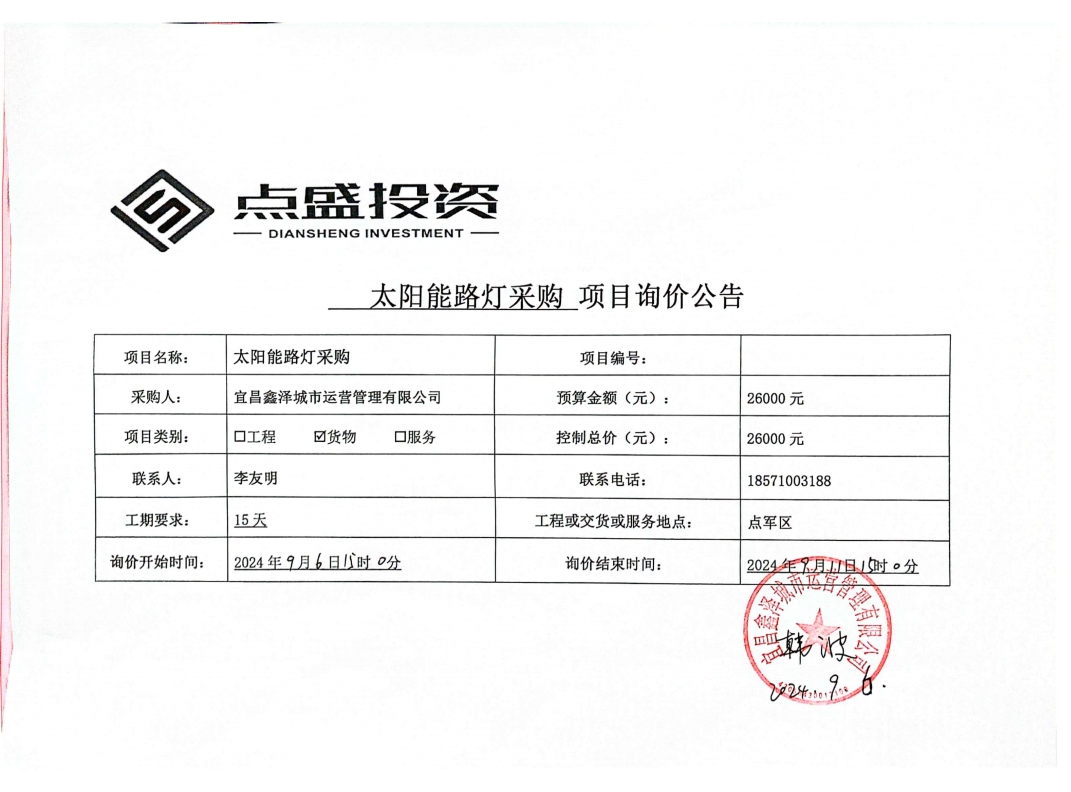 宜昌鑫澤城市運(yùn)營管理有限公司太陽能路燈采購項(xiàng)目詢價公告