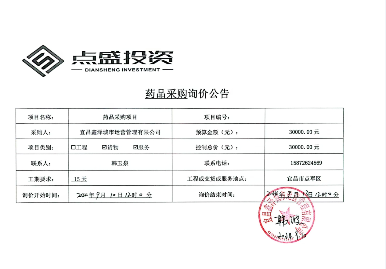 宜昌鑫澤城市運(yùn)營管理有限公司藥品采購項(xiàng)目詢價(jià)公告