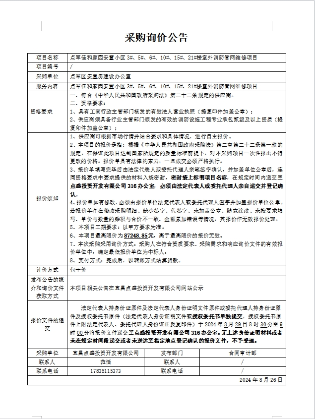 點軍佳和家園安置小區(qū)3#、5#、6#、10#、15#、21#樓室外消防管網(wǎng)維修項目詢價公告