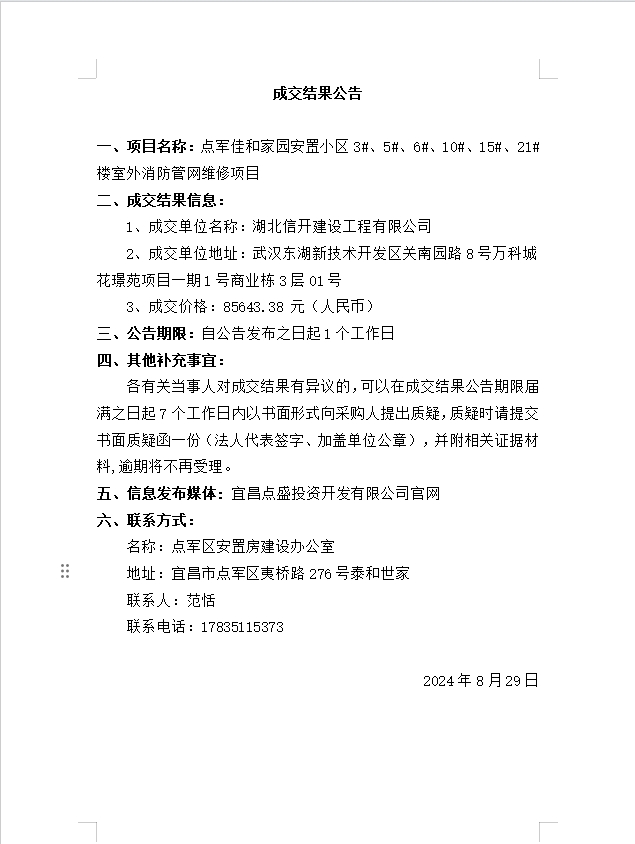 點軍佳和家園安置小區(qū)3#、5#、6#、10#、15#、21#樓室外消防管網維修項目成交公告