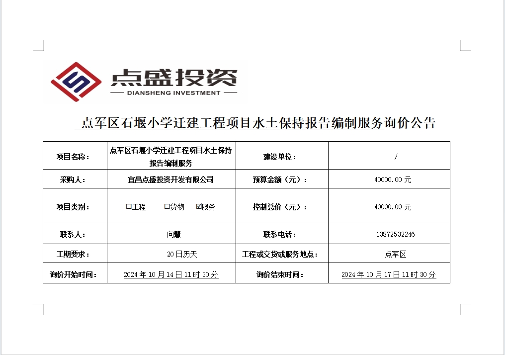 點(diǎn)軍區(qū)石堰小學(xué)遷建工程項(xiàng)目水土保持報(bào)告編制服務(wù)詢價(jià)公告