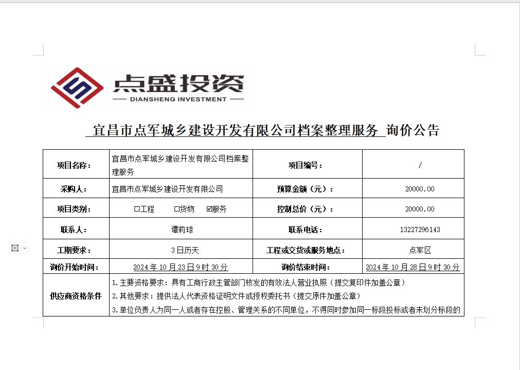 宜昌市點軍城鄉(xiāng)建設開發(fā)有限公司檔案整理服務詢價公告