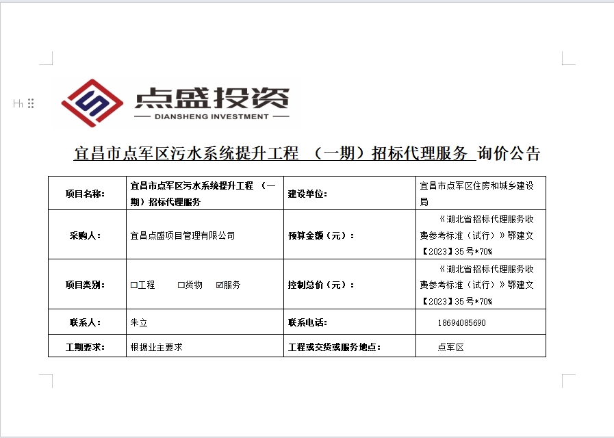 宜昌市點軍區(qū)污水系統(tǒng)提升工程 (一期)招標代理服務詢價公告