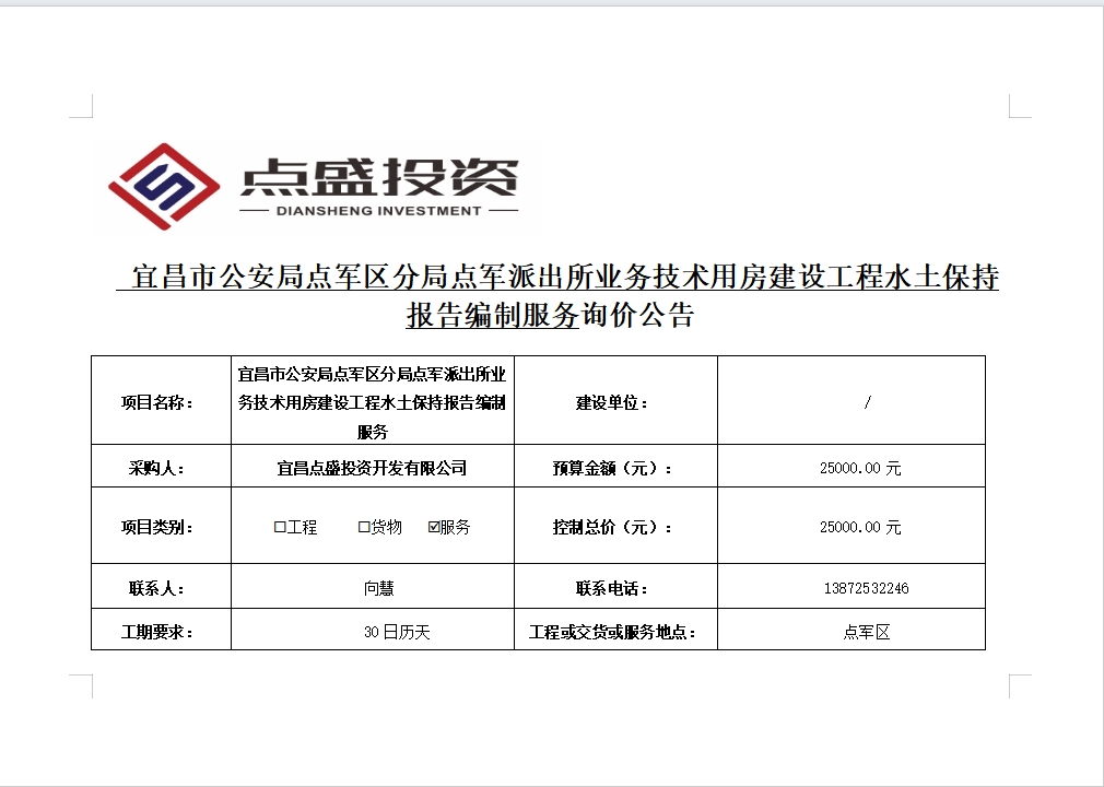 宜昌市公安局點(diǎn)軍區(qū)分局點(diǎn)軍派出所業(yè)務(wù)技術(shù)用房建設(shè)工程水土保持報(bào)告編制服務(wù)詢價公告