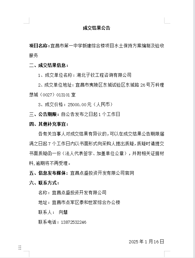 宜昌市第一中學新建綜合樓項目水土保持方案編制及驗收服務(wù)成交公告